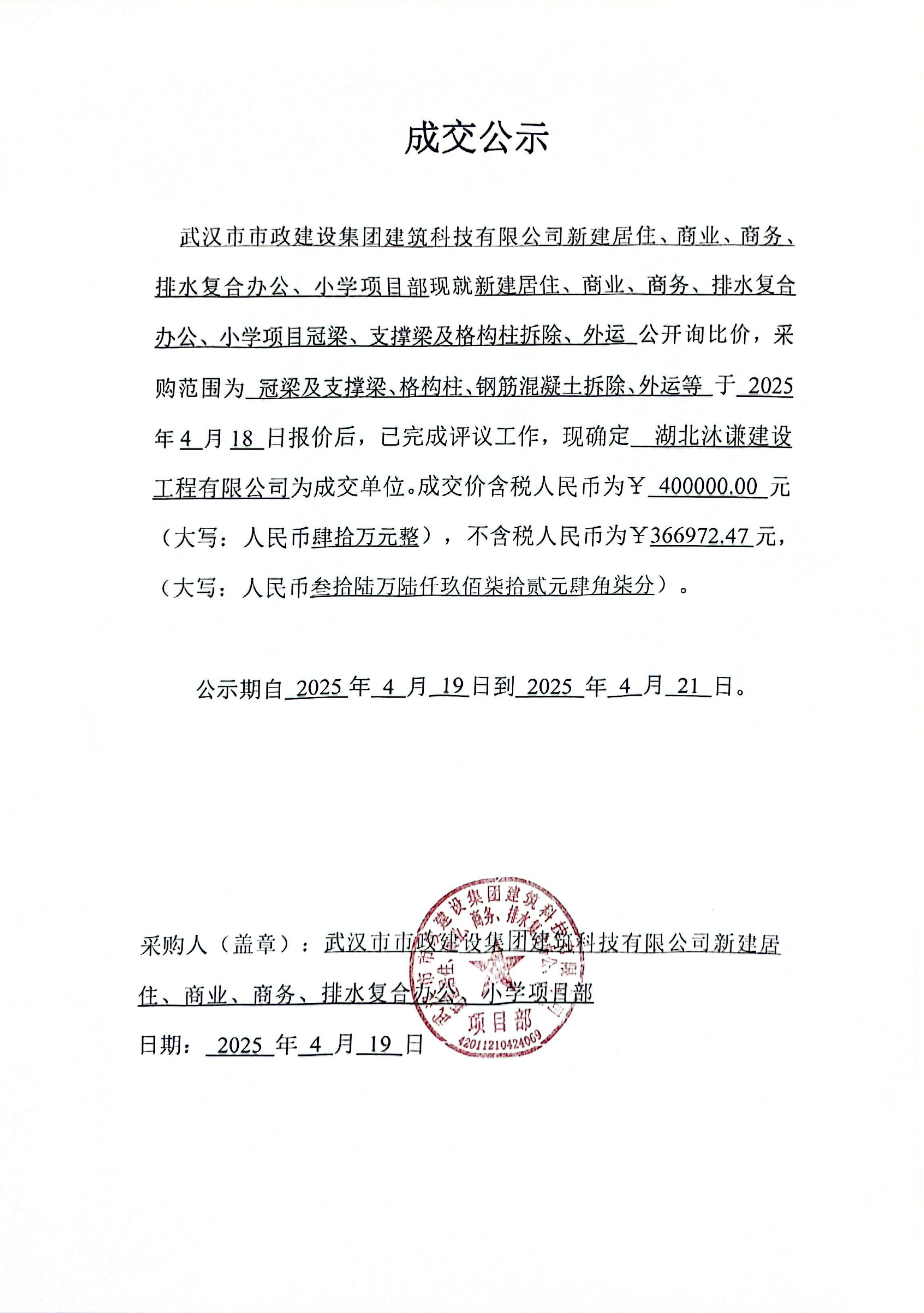 武漢市市政建設集團建筑科技有限公司新建居住、商業(yè)、商務、排水復合辦公、小學項目冠梁、支撐梁及格構柱拆除、外運成交公示