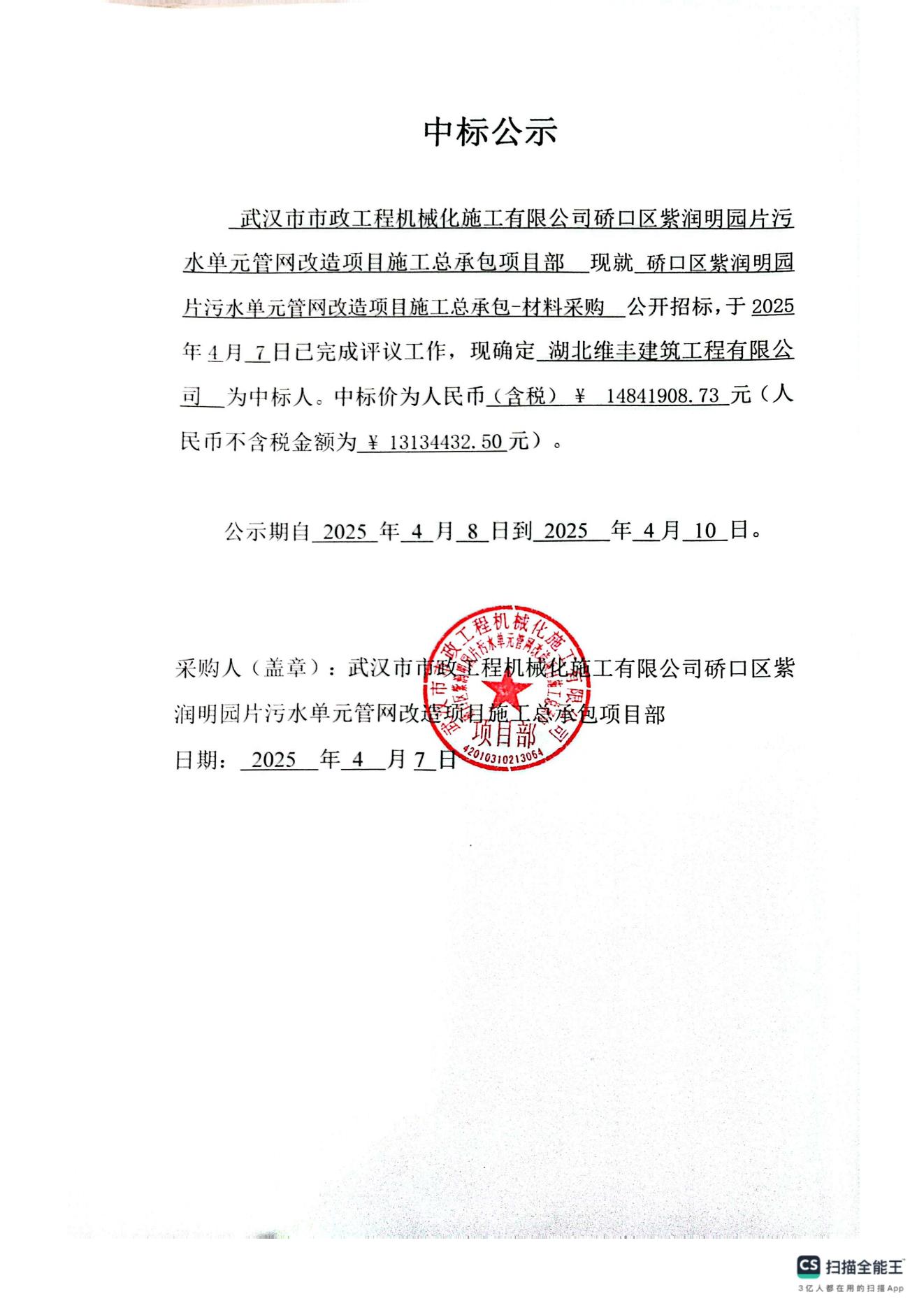 硚口區(qū)紫潤明園片污水單元管網改造項目施工總承包-材料采購中標公示