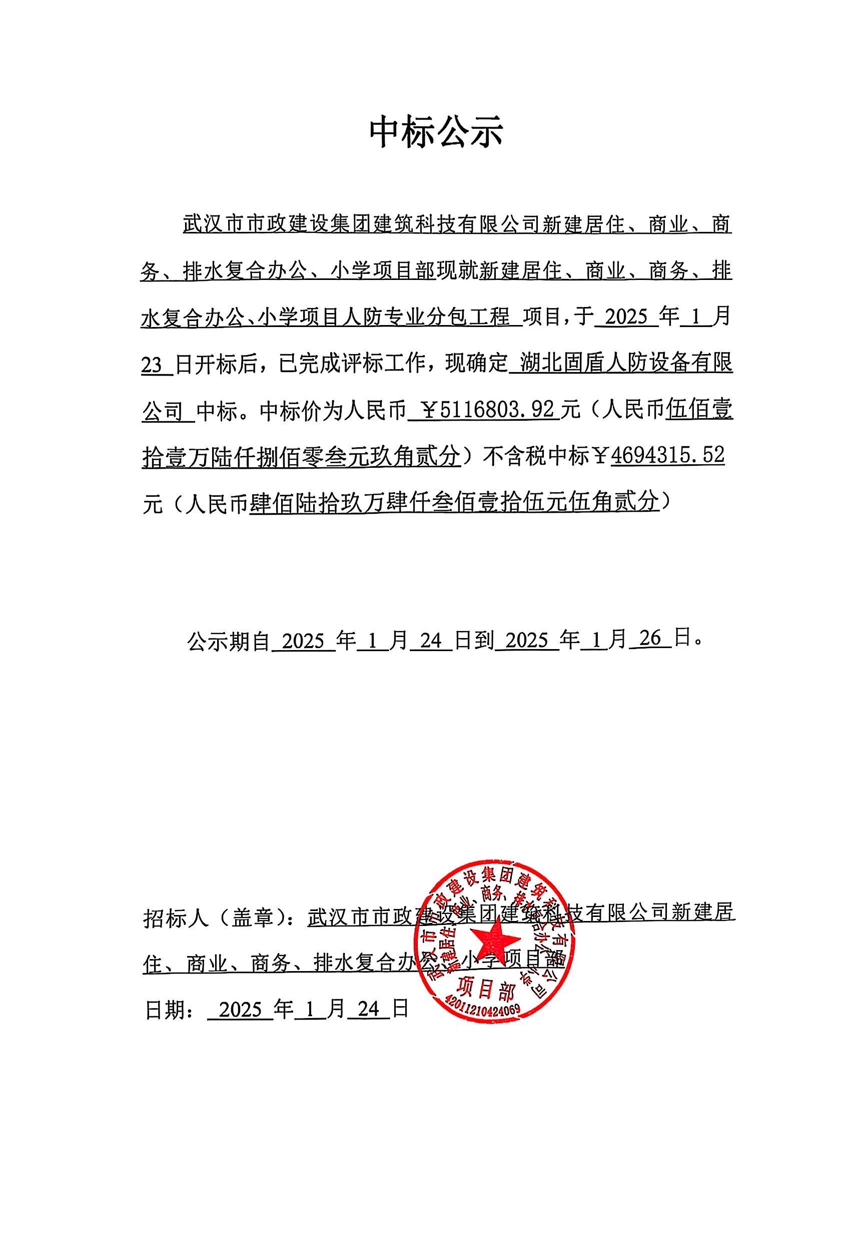 武漢市市政建設集團建筑科技有限公司新建居住、商業(yè)、商務、排水復合辦公、小學項目人防專業(yè)分包工程 中標公示