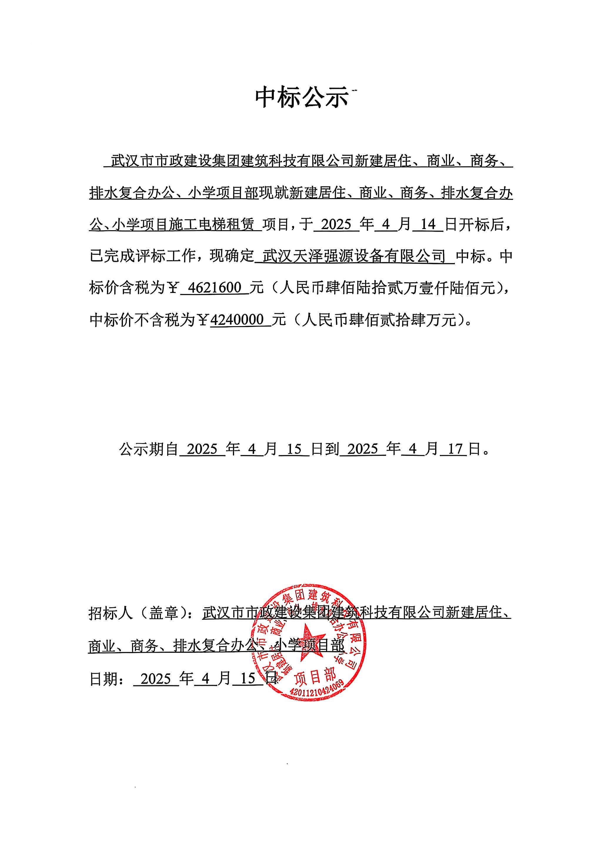 武漢市市政建設(shè)集團(tuán)建筑科技有限公司新建居住、商業(yè)、商務(wù)、排水復(fù)合辦公、小學(xué)項目施工電梯租賃中標(biāo)公示