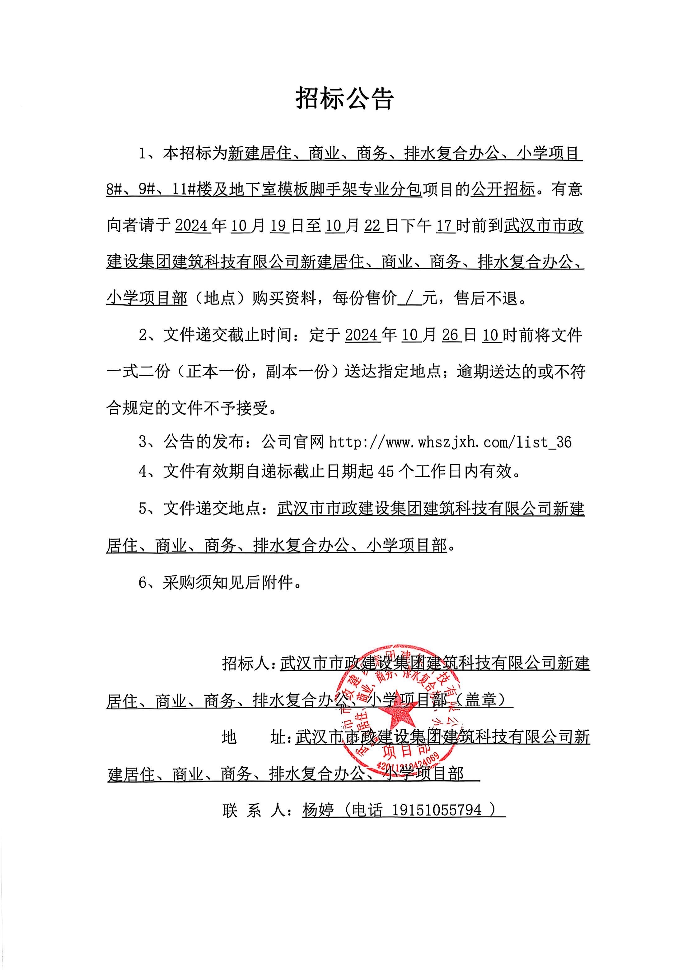 武漢市市政建設(shè)集團(tuán)建筑科技有限公司新建居住、商業(yè)、商務(wù)、排水復(fù)合辦公、小學(xué)項(xiàng)目8#、9#、11#樓及地下室模板腳手架專(zhuān)業(yè)分包招標(biāo)公告