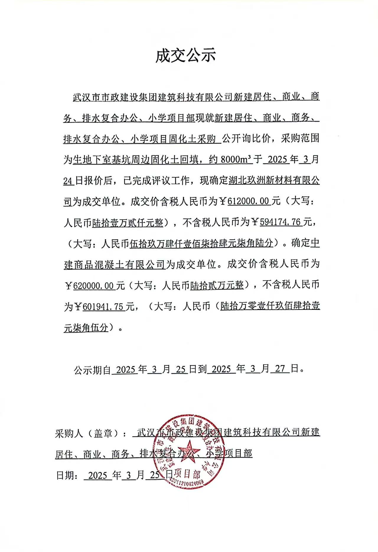武漢市市政建設(shè)集團建筑科技有限公司新建居住、商業(yè)、商務(wù)、排水復合辦公、小學項目固化土采購成交公示
