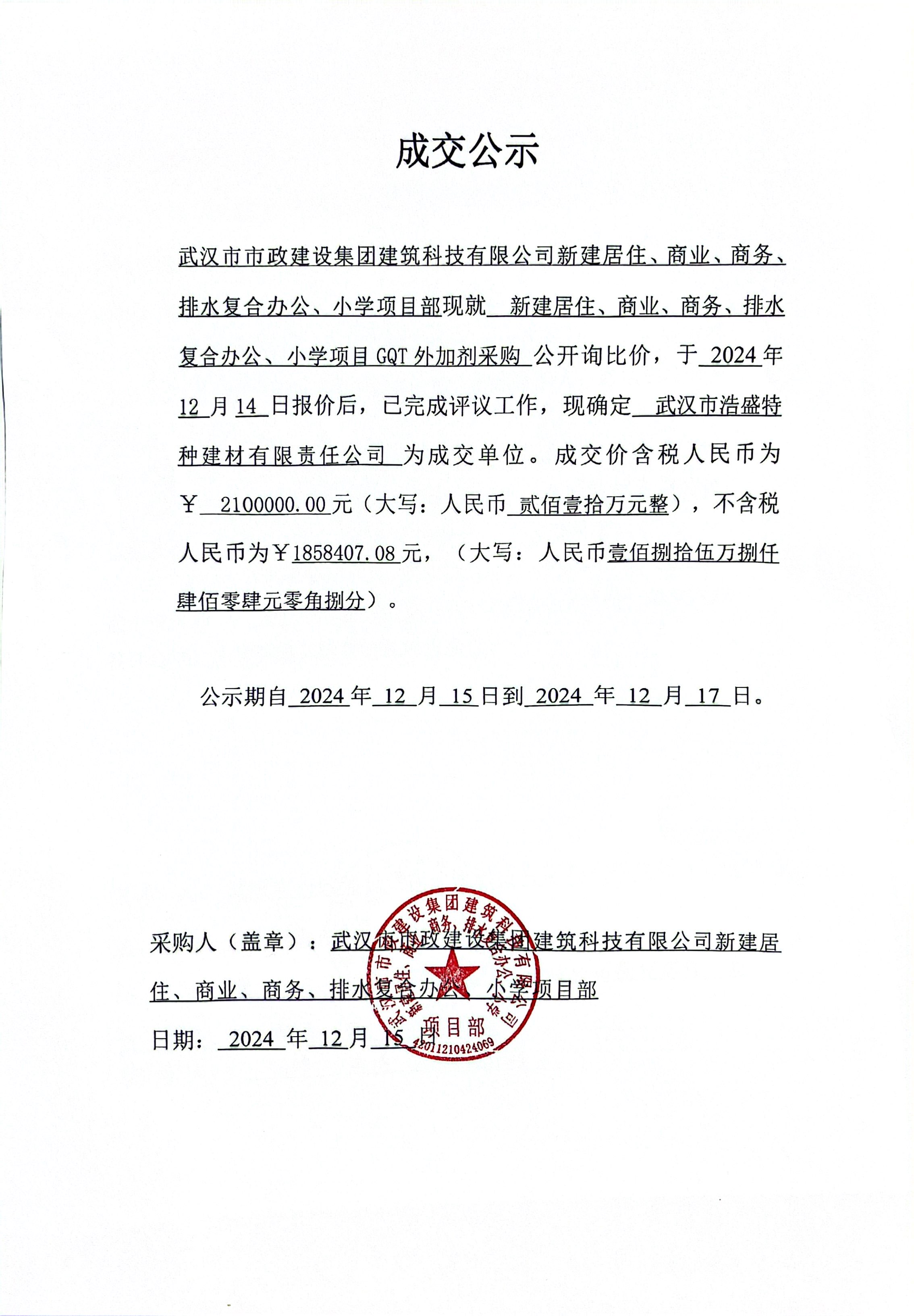 武漢市市政建設(shè)集團(tuán)建筑科技有限公司新建居住、商業(yè)、商務(wù)、排水復(fù)合辦公、小學(xué)項目GQT外加劑采購成交公示