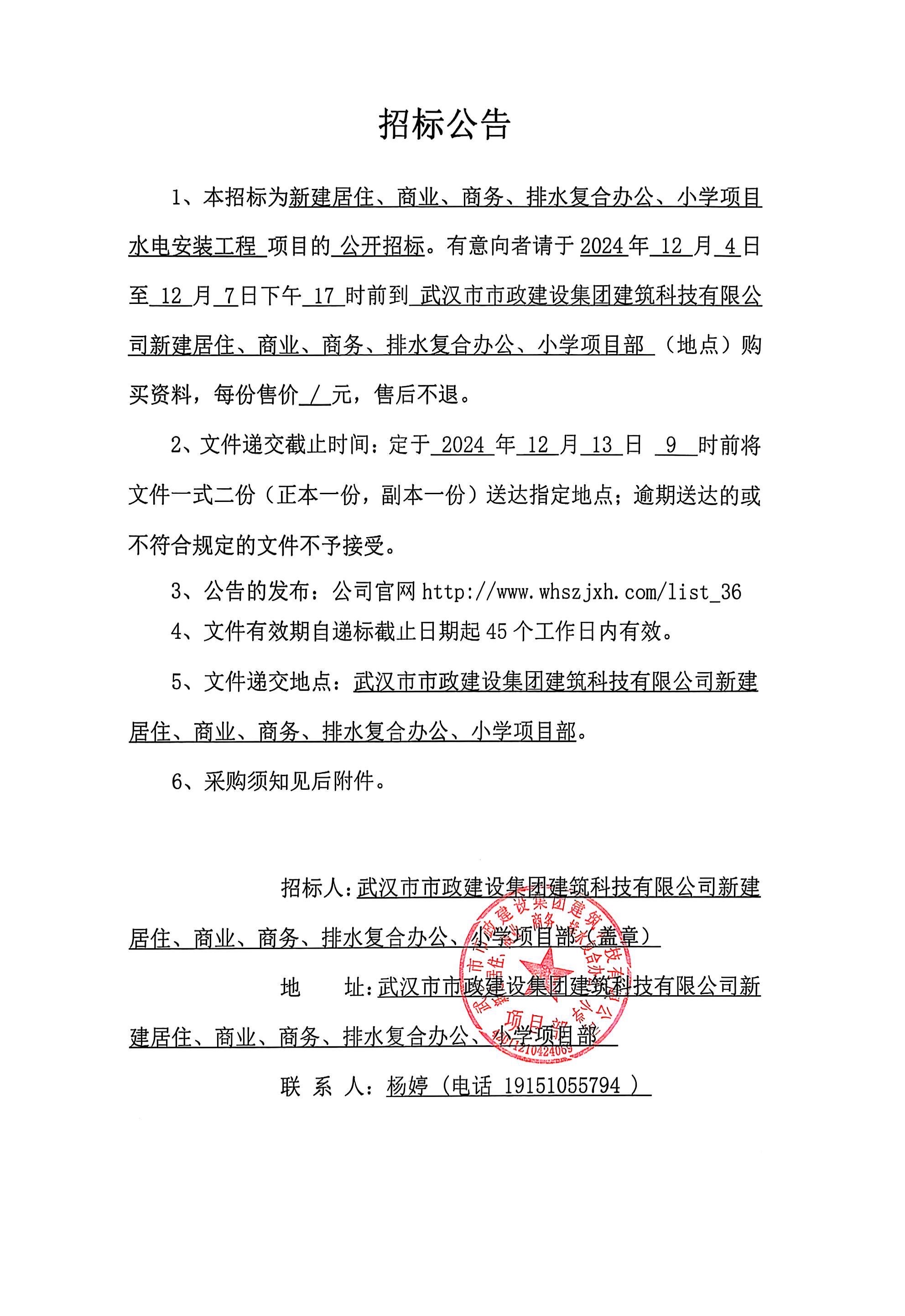 武漢市市政建設集團建筑科技有限公司新建居住、商業(yè)、商務、排水復合辦公、小學項目水電安裝工程招標公告