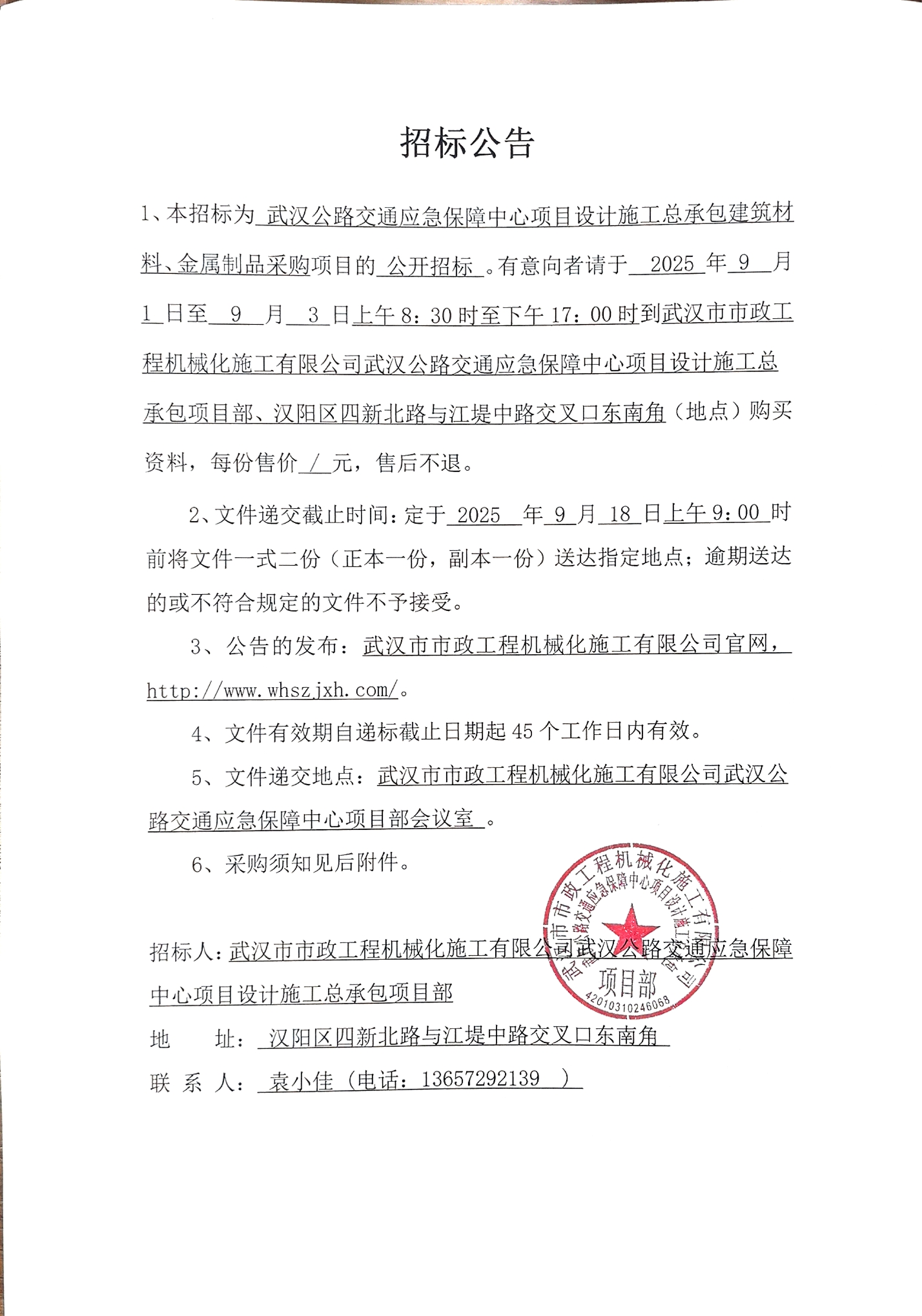 武漢公路交通應(yīng)急保障中心項目設(shè)計施工總承包建筑材料、金屬制品采購招標(biāo)公告