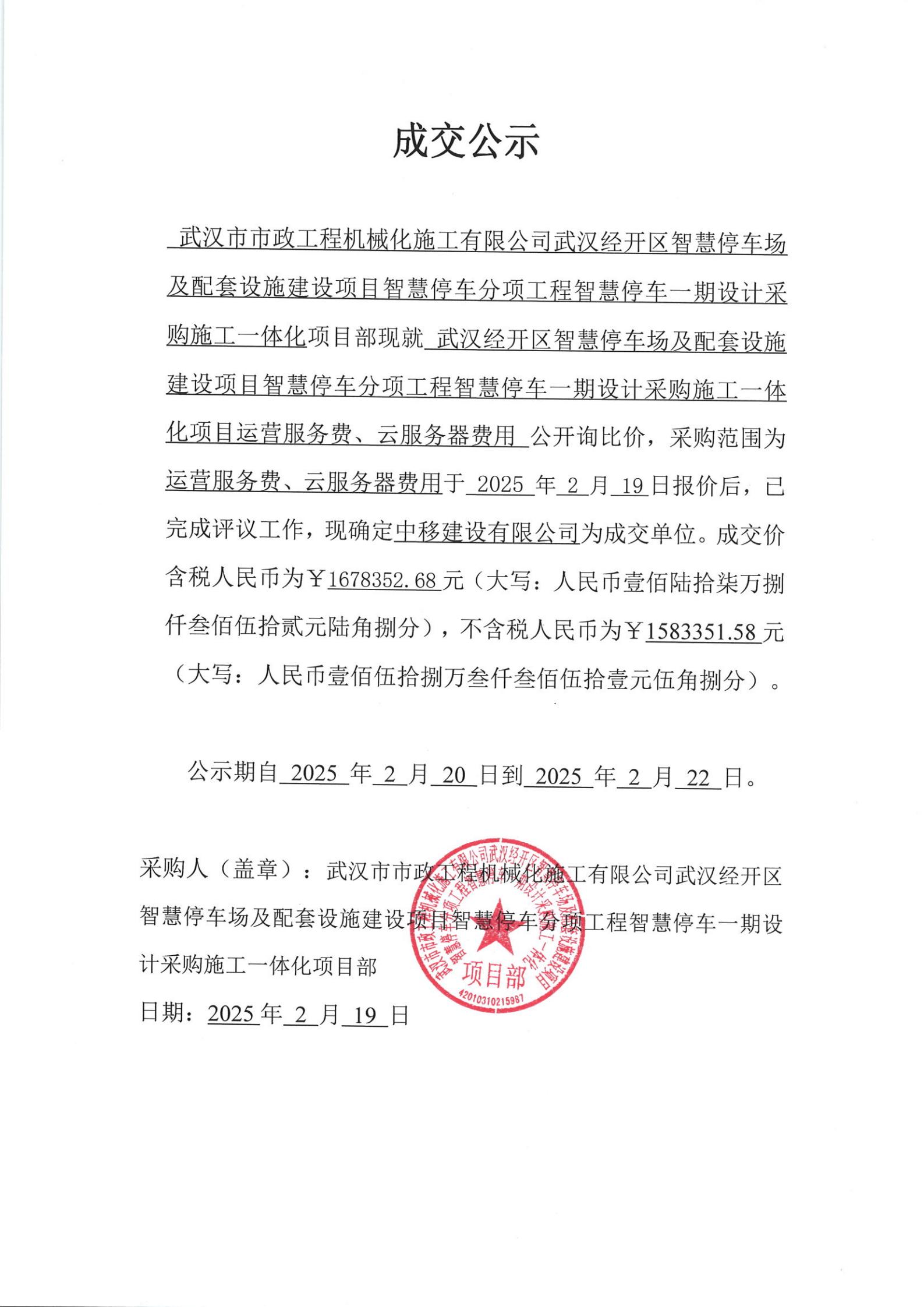 武漢經(jīng)開(kāi)區(qū)智慧停車(chē)場(chǎng)及配套設(shè)施建設(shè)項(xiàng)目智慧停車(chē)分項(xiàng)工程智慧停車(chē)一期設(shè)計(jì)采購(gòu)施工一體化項(xiàng)目運(yùn)營(yíng)服務(wù)費(fèi)、云服務(wù)器費(fèi)用成交公示