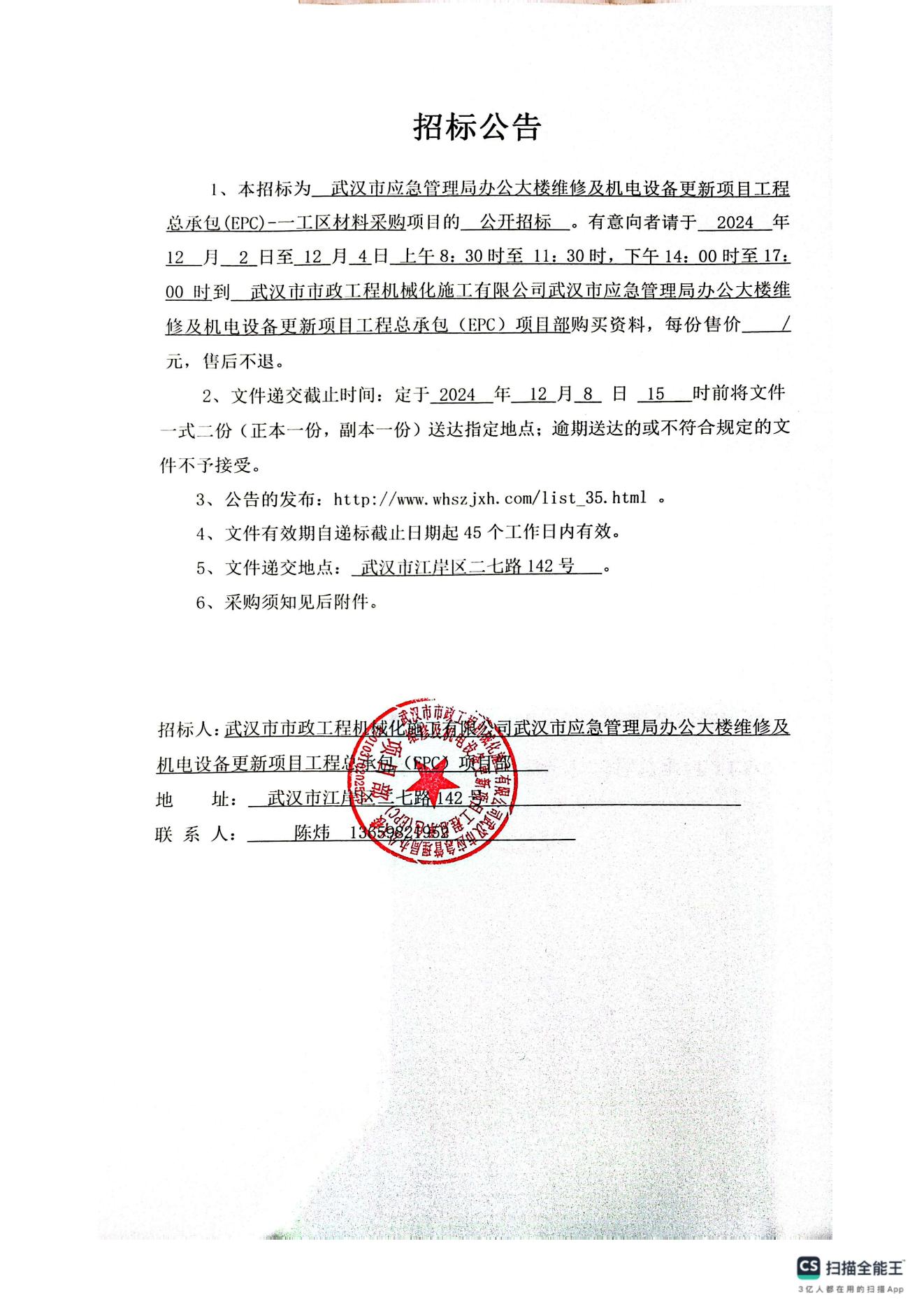 武漢市應(yīng)急管理局辦公大樓維修及機(jī)電設(shè)備更新項(xiàng)目工程總承包(EPC)-一工區(qū)材料采購招標(biāo)公告