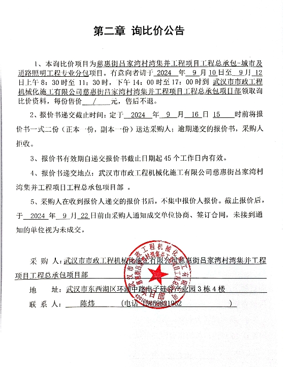 慈惠街呂家灣村灣集并工程項目工程總承包-城市及道路照明工程專業(yè)分包詢價公告
