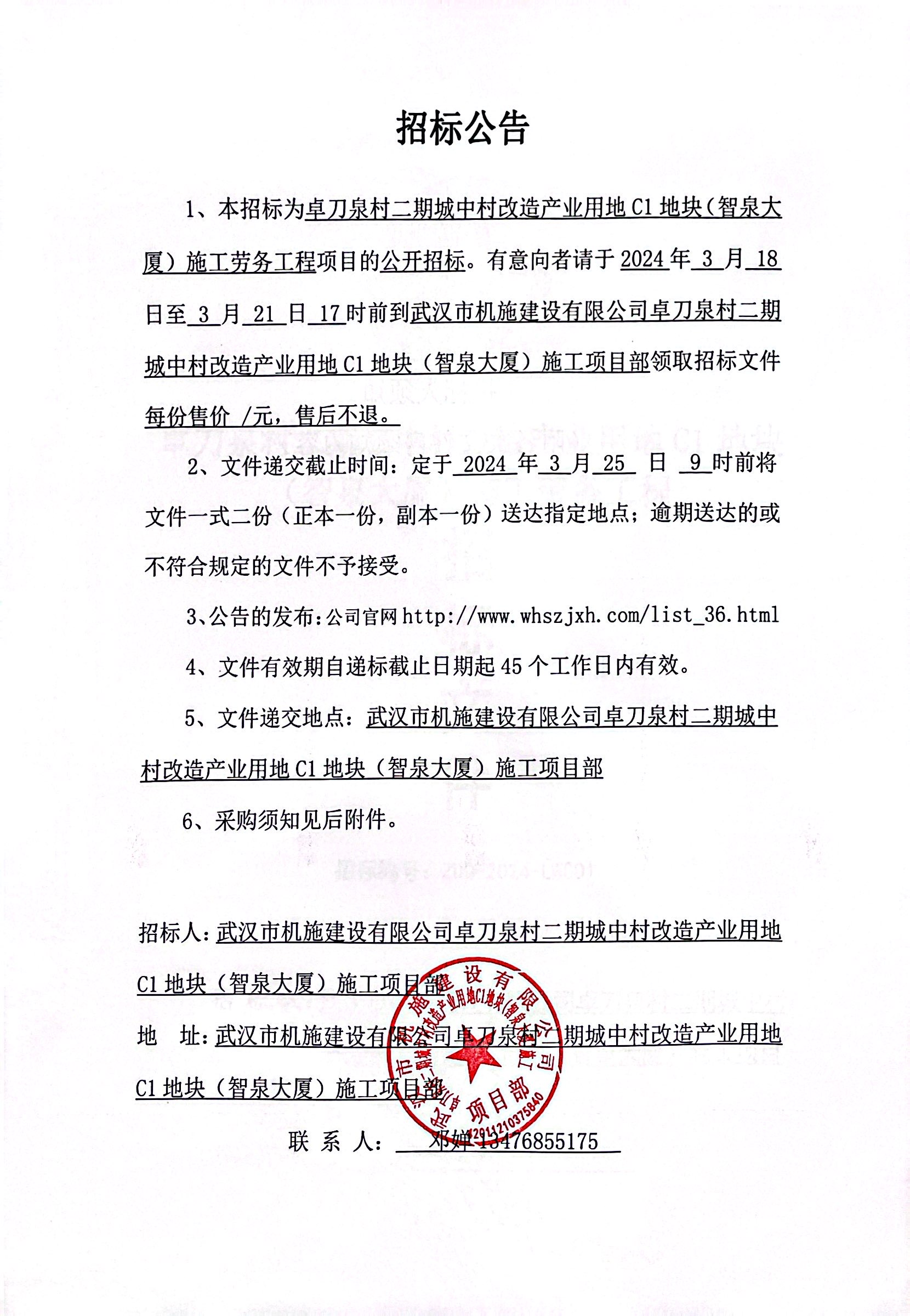 武漢市機(jī)施建設(shè)有限公司卓刀泉村二期城中村改造產(chǎn)業(yè)用地C1地塊(智泉大廈)施工勞務(wù)工程招標(biāo)公告