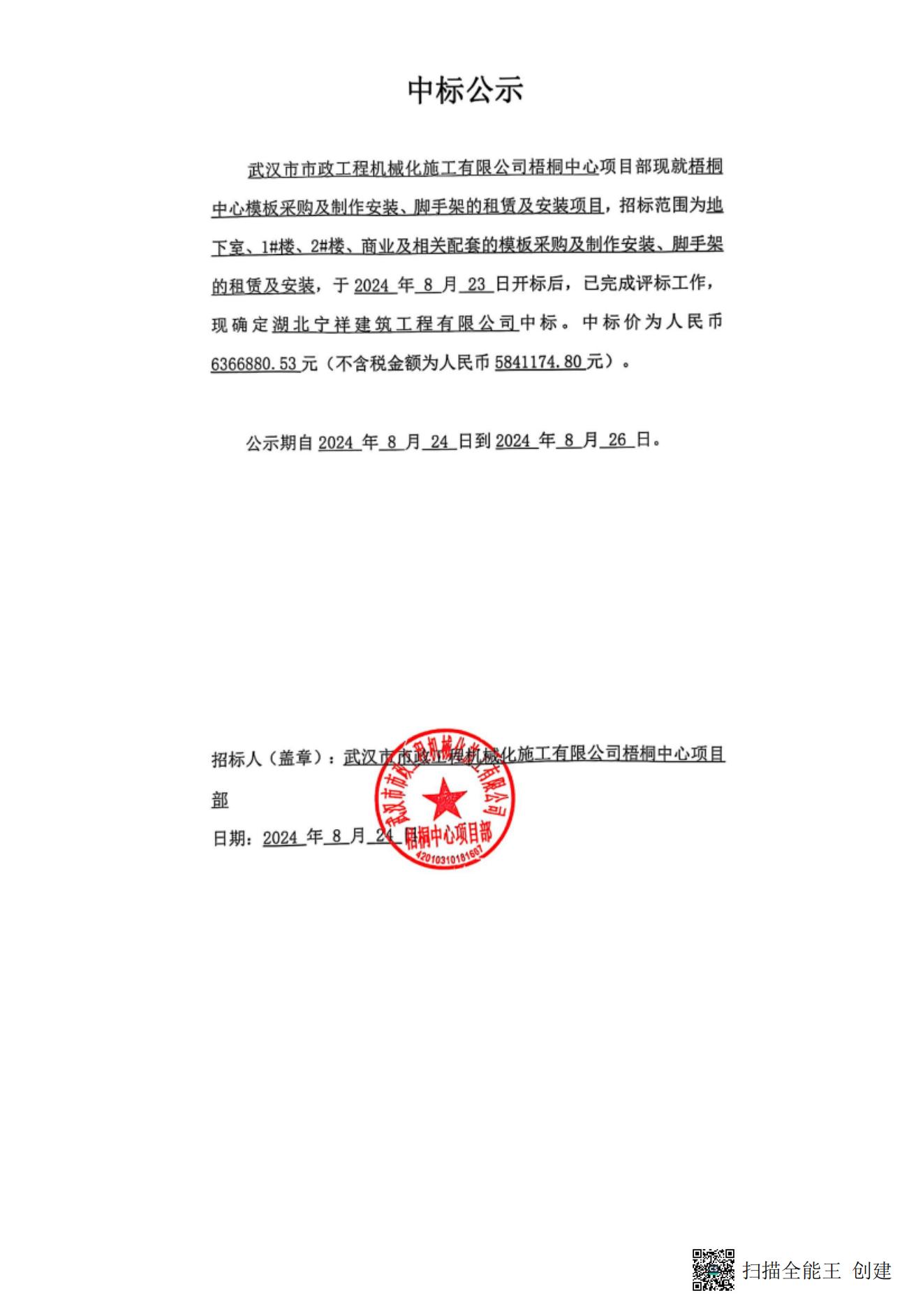 梧桐中心模板采購及制作安裝、腳手架的租賃及安裝成交公示