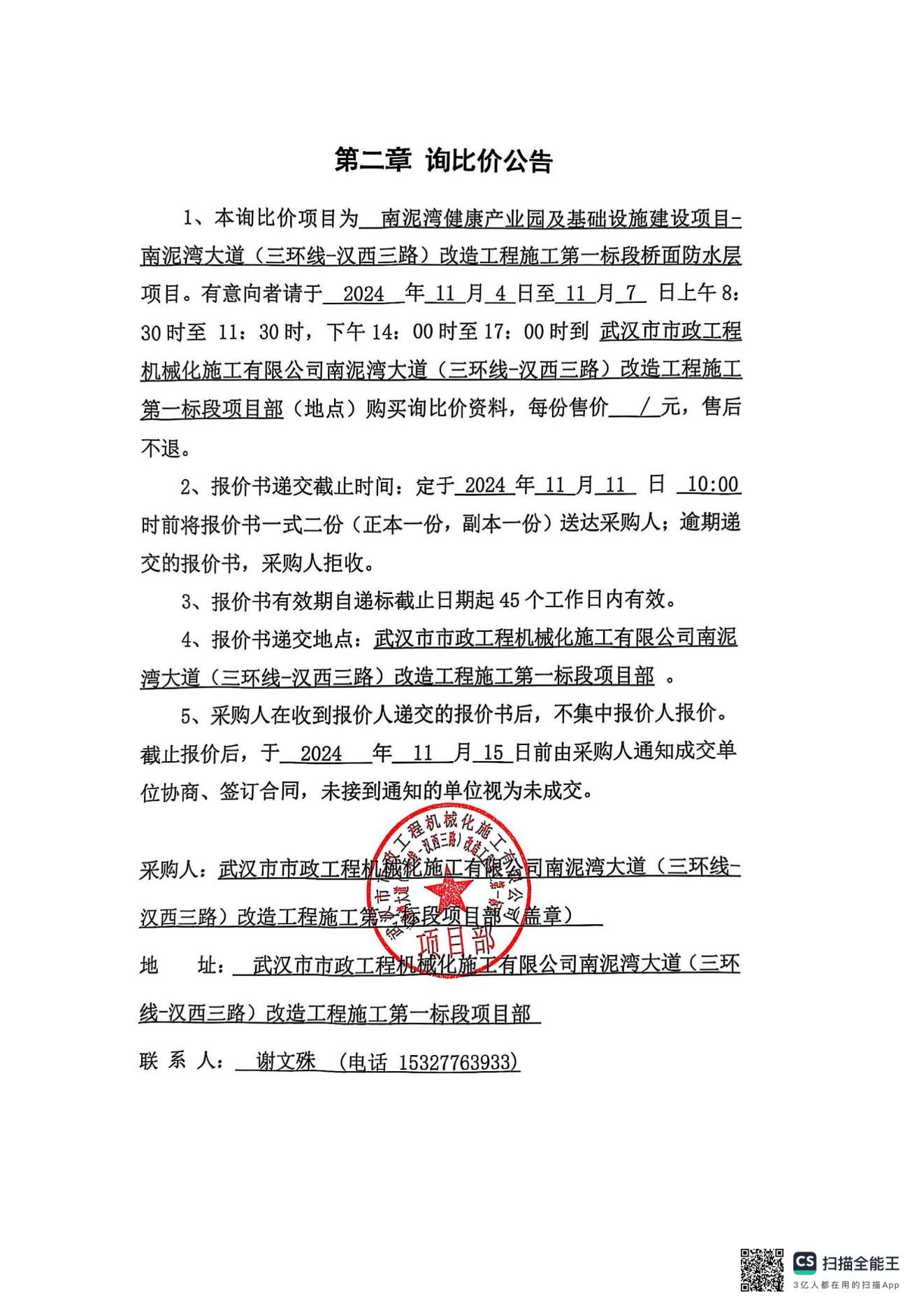 南泥灣健康產(chǎn)業(yè)園及基礎(chǔ)設(shè)施建設(shè)項(xiàng)目-南泥灣大道(三環(huán)線-漢西三路)改造工程施工第一標(biāo)段橋面防水層詢價公告