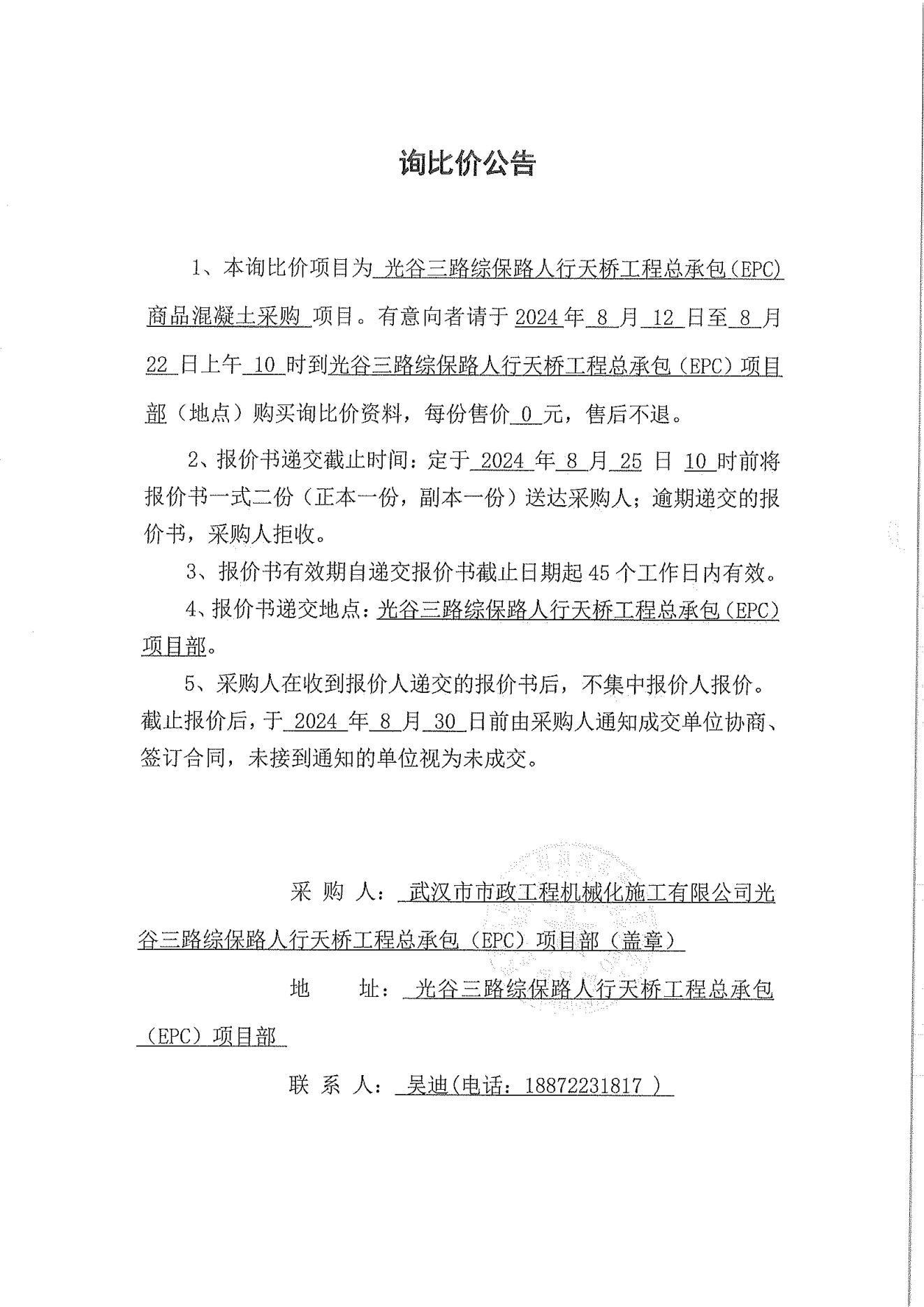 光谷三路綜保路人行天橋工程總承包(EPC)商品混凝土采購詢價公告