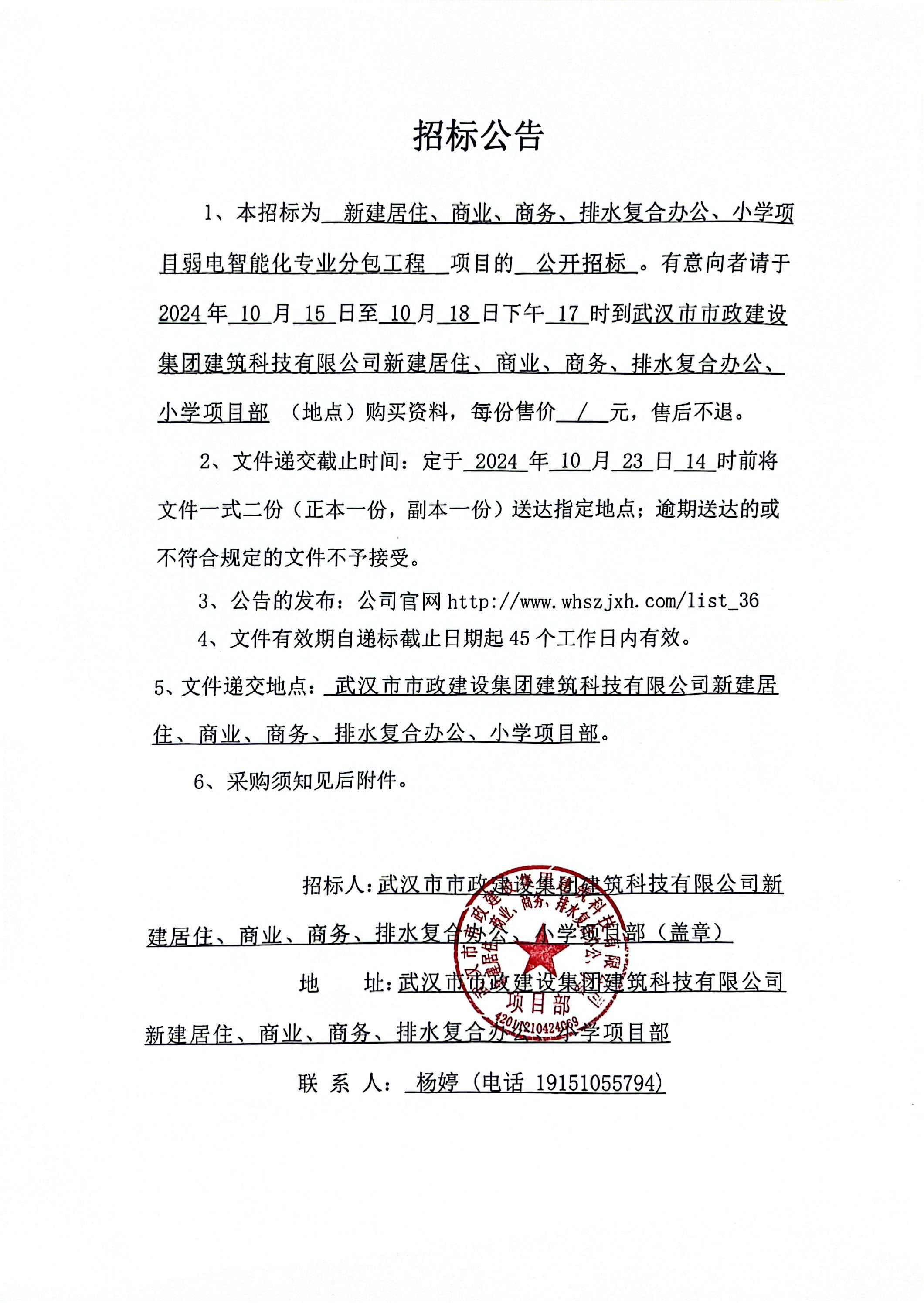 武漢市市政建設集團建筑科技有限公司新建居住、商業(yè)、商務、排水復合辦公、小學項目弱電智能化專業(yè)分包工程招標公告